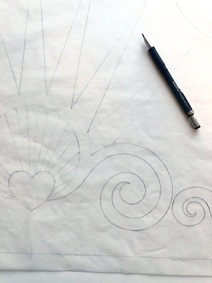 I knew I wanted a combination of organic shapes and geometric lines. I started to sketch out some ideas, then when I was close, I mapped out the design onto my trace pattern pieces. I needed two identical sleeves, back, collar and right and left front and pocket pieces.