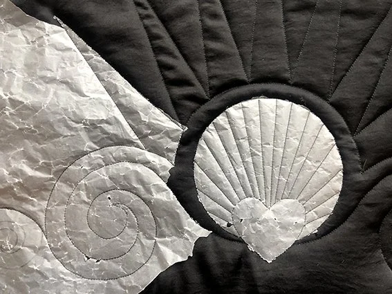I stitched the design through all four layers - trace, outer, wadding and inner. I tried to work from one edge across to the other so I could keep the layers of fabric at the same tension.