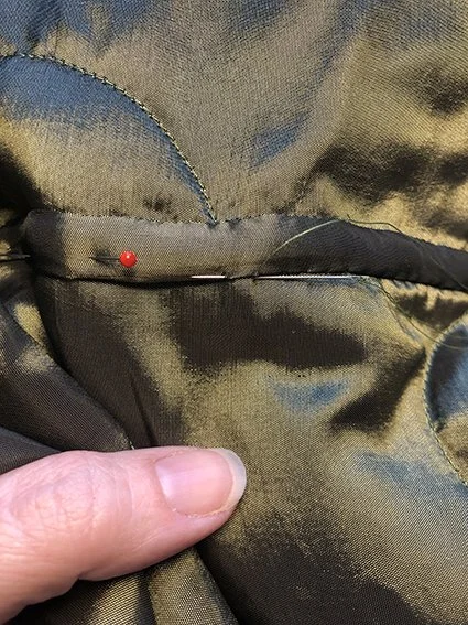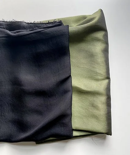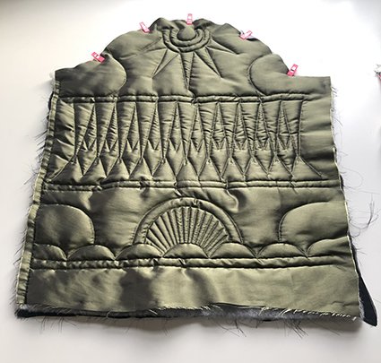 I chose a washed silk-style viscose in black for the outer and a slightly two-tone khaki for the lining, sandwiching some polyester wadding between them. I roughly basted the layers together with very large stitches across the width.