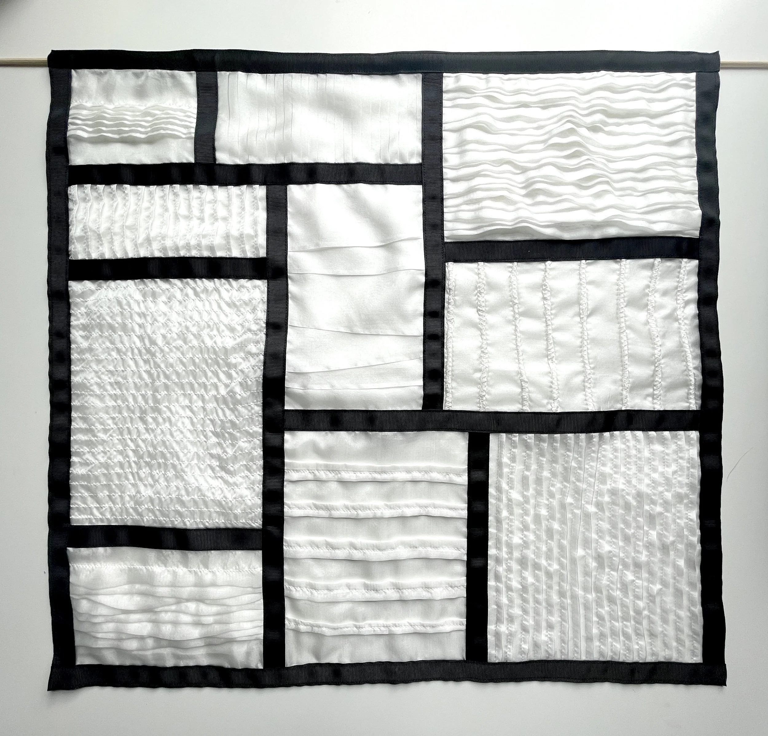 I’ve been experimenting with making different linear textures in silk. Gathering, ruching, pleating, stitching, pressing, layering… In the end, they looked lovely when they were sat together so I bound them into squares with some grosgrain ribbon and here we are.